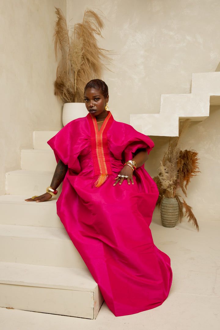The boubou, traditionally expensive, is being re-engineered into sculptural eveningwear. Volume is sharpened. Sleeves are controlled. Fabric is layered to create dimension without overwhelming the body—metallic thread glints against handwoven cotton. Silk overlays soften geometric tailoring.