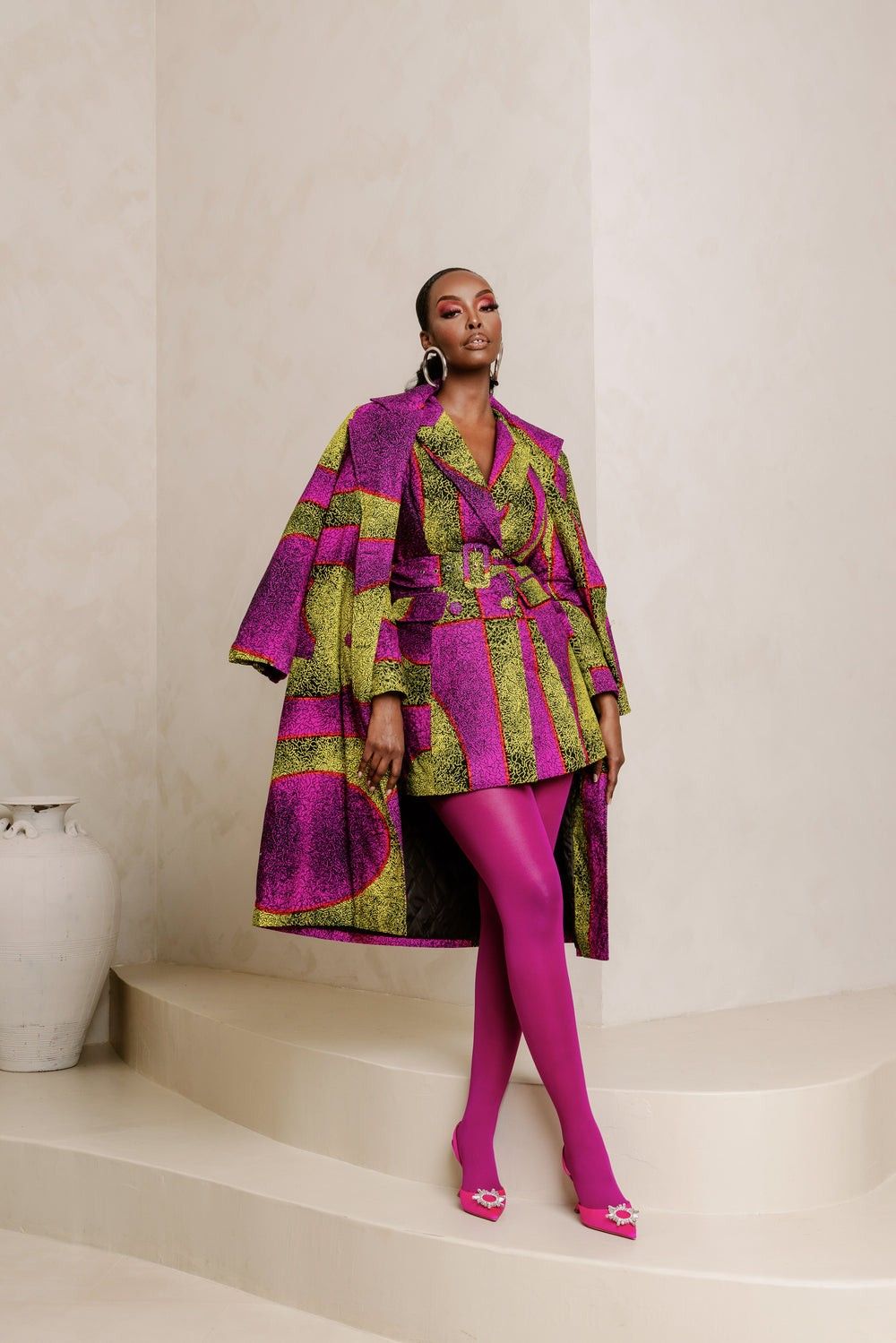 I always begin with a large-scale print as the main piece. For example, I might choose a bold, long Ankara duster coat with significant floral patterns. To balance the look, I add a small-scale print, like pinstriped silk trousers or a tiny geometric-print blouse from Lisa Folawiyo. This creates a clear visual order that looks thoughtful and polished. This method is also sustainable because you’re not just buying matching sets; you’re finding new ways to wear what you already have, so your style feels new and elegant.