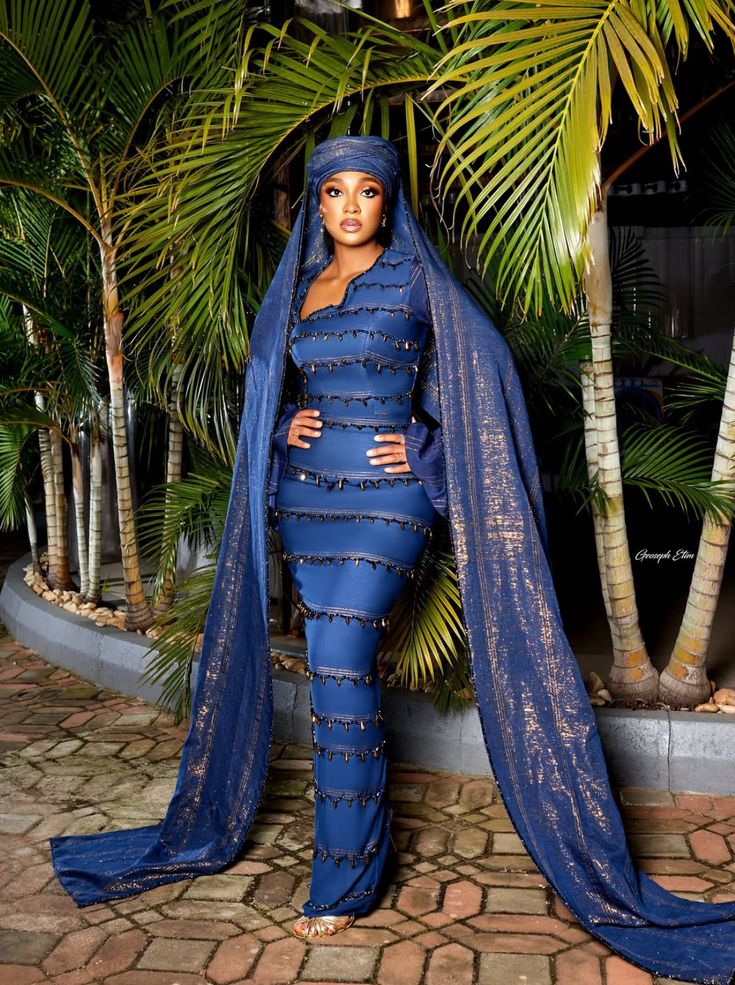 A fitted Bazin crop top with wide-leg Bazin trousers in a deep sapphire, worn with a simple Gyale tied flat and the Kwottenai Kanye at the ears, is a complete Fulani cultural statement in a contemporary silhouette. The Pulaaku standard of modesty is met without compromise. The fabric is Fulani. The occasion can be anywhere.